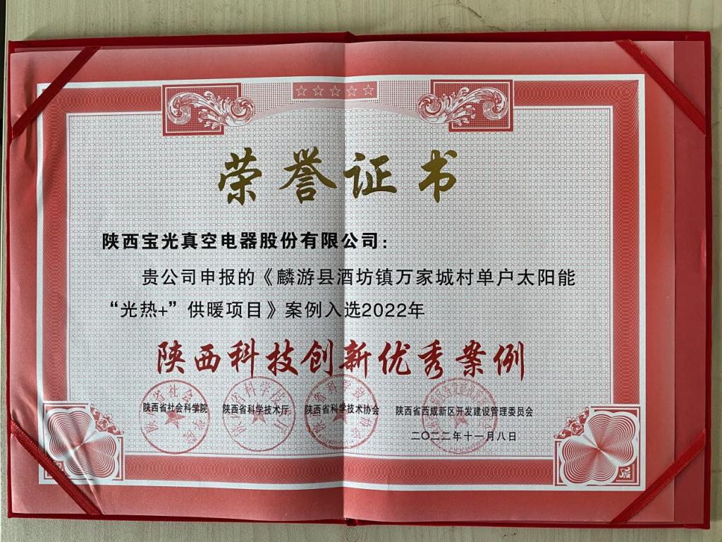 近日,陜西省社會科學院、陜西省科學技術廳、陜西省科學技術協(xié)會、陜西省西咸新區(qū)開發(fā)建設管理委員會聯(lián)合發(fā)布“2022年陜西科技創(chuàng)新優(yōu)秀案例”,寶光股份申報的《麟游縣酒坊鎮(zhèn)萬家城村單戶太陽能“光熱+”供暖項目》成功獲選高效治理高品質生活組“陜西科技創(chuàng)新優(yōu)秀案例”。